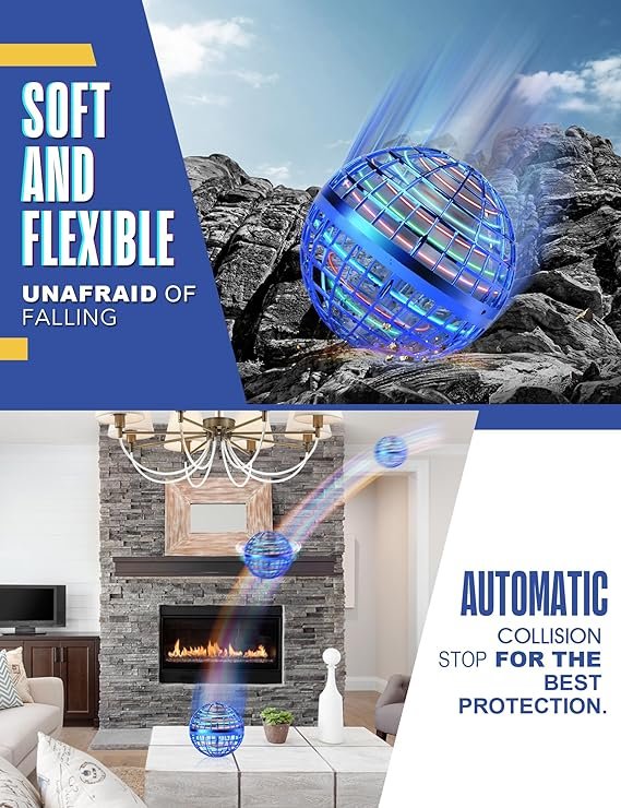 【High-Tech Flying Orb Ball】Experience intelligent flight with our hand-controlled drone ball featuring a gyroscope and smart AI chip. It lights up with vibrant colors and offers a variety of flight routes, skills, and smooth flight modes, including boomerang effects. 【Safety First with Protective Cage】Our cool cosmic globe flying ball toy is equipped with a 2023 modified soft ABS cage that is lightweight, flexible, and drop-resistant. The cage of the galactic fidget spinner ball encloses propellers and upgraded mesh shell layers, ensuring your children’s fingers are completely protected. 【Perfect Gift for All Occasions】
